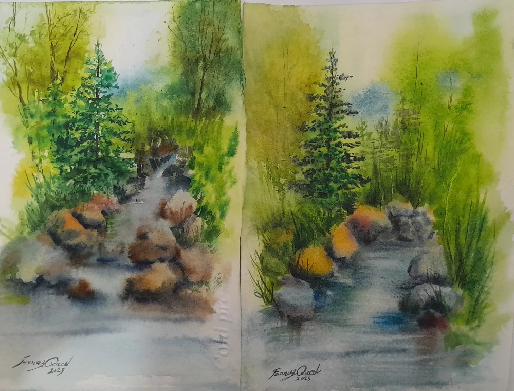 دو نقاشی پیش رو، نقاشی کاج و رود، را همزمان با کمک حرکت آزادانه رنگ و مهارت قلم کار کردم.
